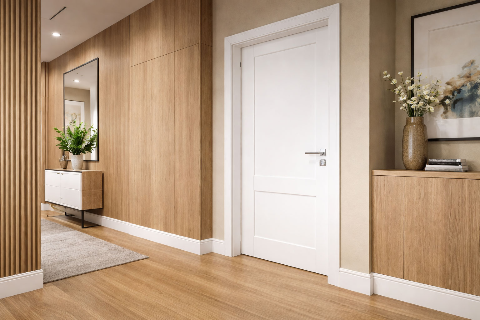 A integração entre porta pronta, painéis e rodapés define a leitura arquitetônica e eleva o padrão estético do ambiente.